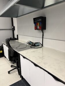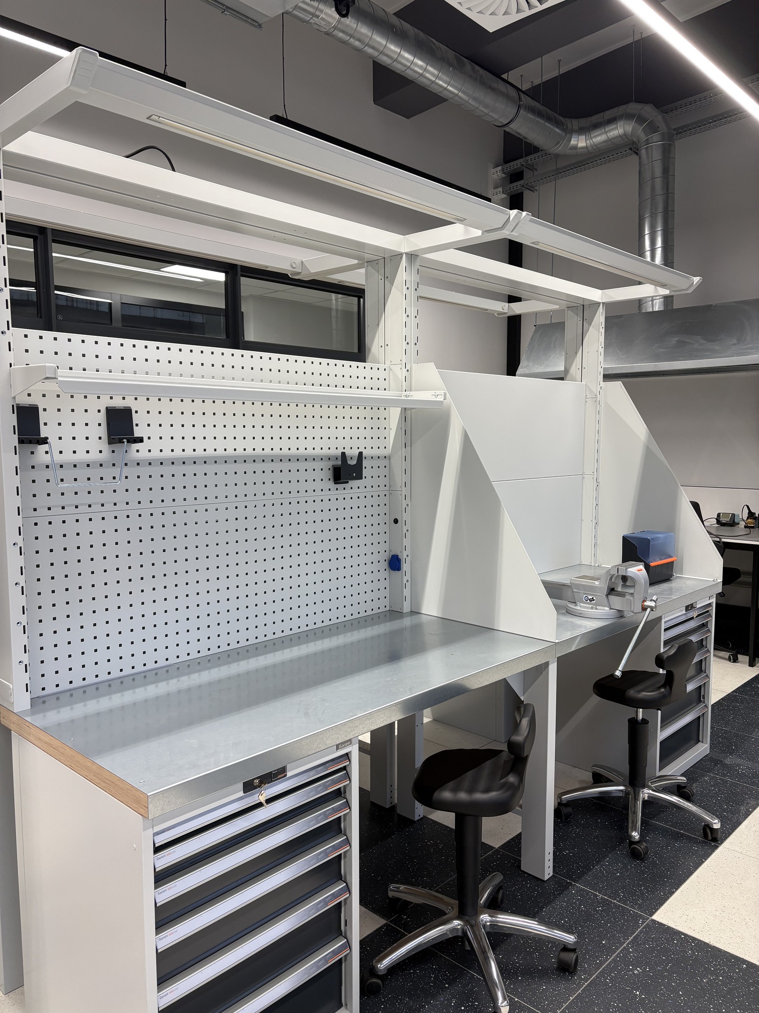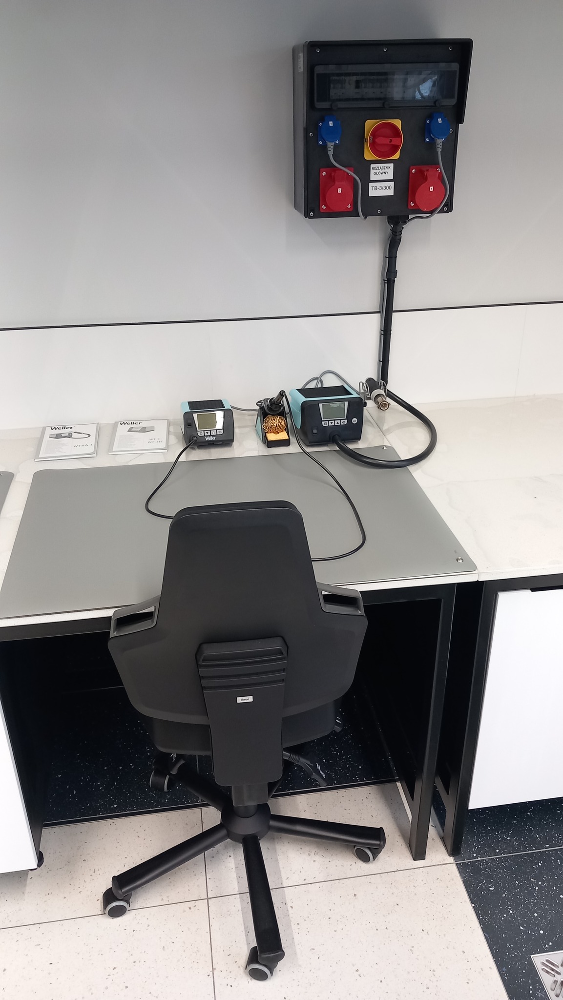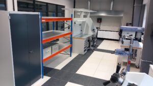 - Strefę czystą, przeznaczoną do prac elektronicznych, wyposażoną m.in. w stanowiska do lutowania, oświetlenie LED, maty ESD oraz ergonomiczne miejsca pracy.