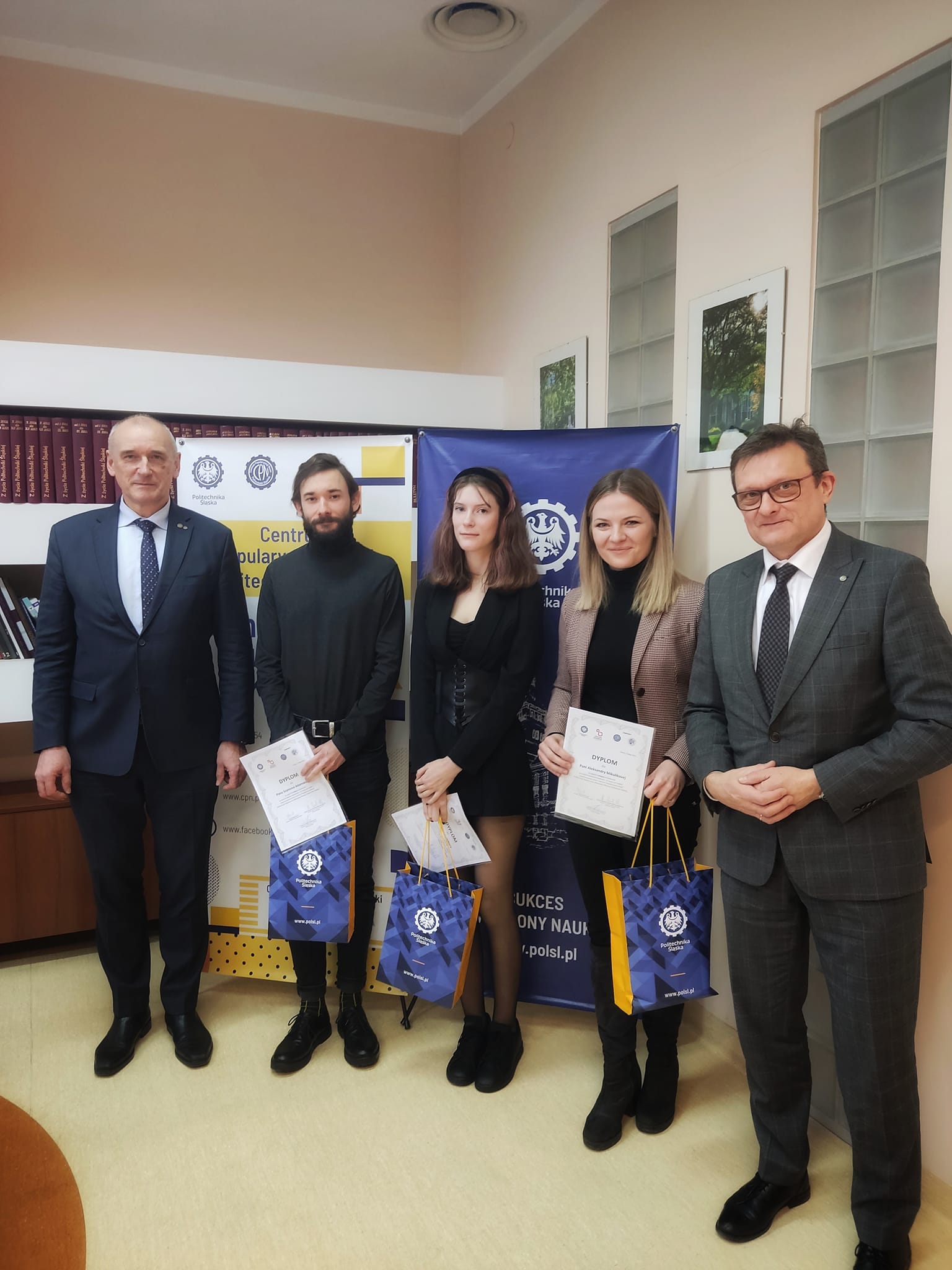 Nagrody laureatom konkursu wręczyli prorektor ds. infrastruktury i promocji dr hab. inż. Tomasz Trawiński, prof. PŚ, oraz prorektor ds. ogólnych prof. dr hab. inż. Bogusław Łazarz. W spotkaniu wzięli udział dyrektor Centrum Popularyzacji Nauki dr hab. Aleksandra Ziembińska-Buczyńska, prof. PŚ, , dyrektor Akademickiego Liceum Ogólnokształcącego w Gliwicach dr Małgorzata Borysławska oraz dr Aleksandra Chrupała.