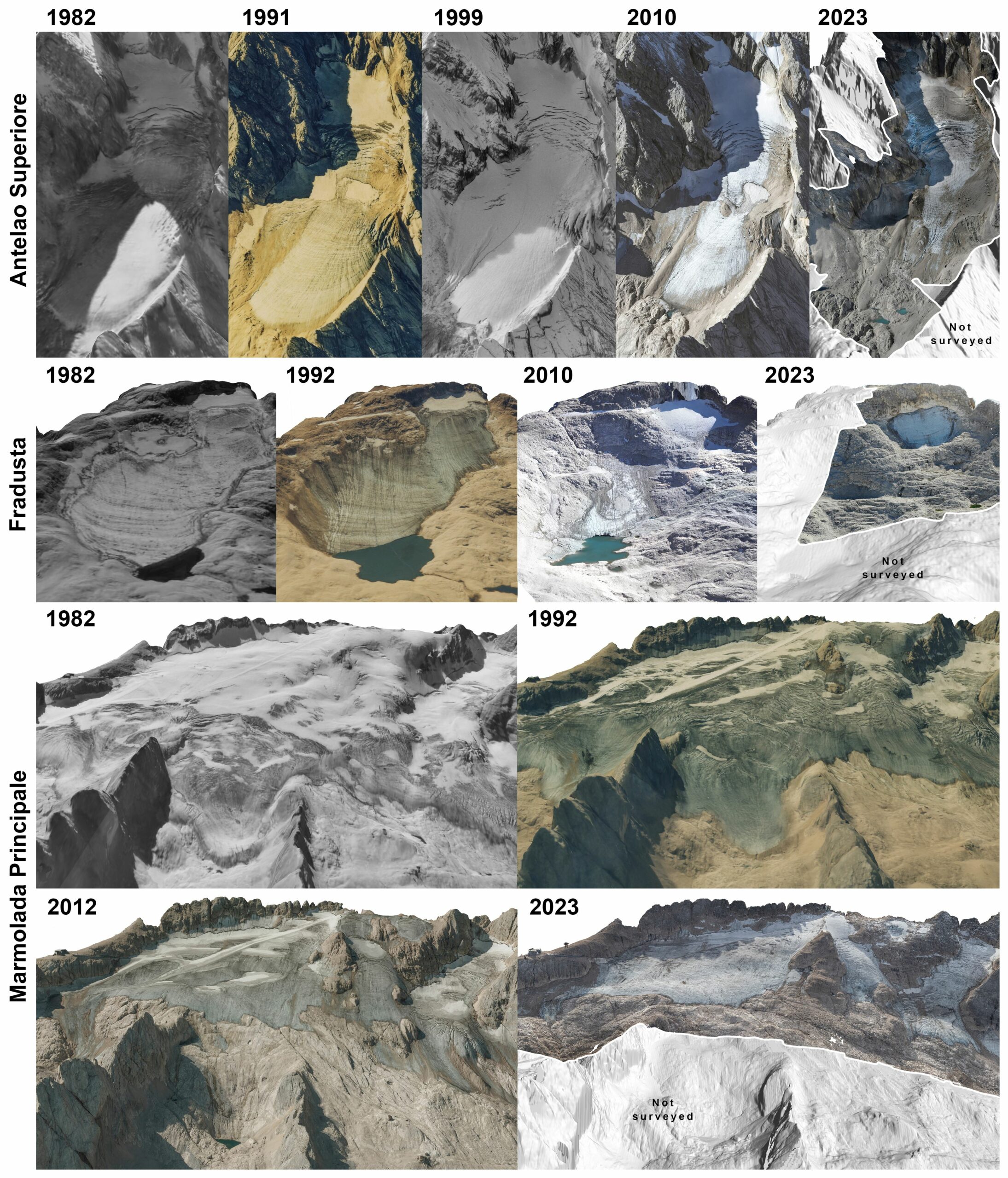 Zmiany w strukturze i masie lodowców w ostatnich 40 latach można zobaczyć na rekonstrukcji (poniższy rysunek: Figure 2) przygotowanej w artykule "The glaciers of the Dolomites: the last 40 years of melting" z roku 2025 przez naukowców m.in. Uniwersytetu Ca' Foscari w Wenecji, Instytutu Nauk Polarnych Narodowej Rady Badań Naukowych we Włoszech, Włoskiego Komitetu Glacjologicznego. Jak podsumowują badacze, przed czterema dekadami w Dolomitach znajdowały się dziesiątki lodowców. Dziś natomiast jest ich zaledwie 12.