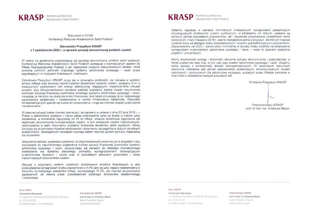 KRASP's appeal regarding the economic situation of Polish universities