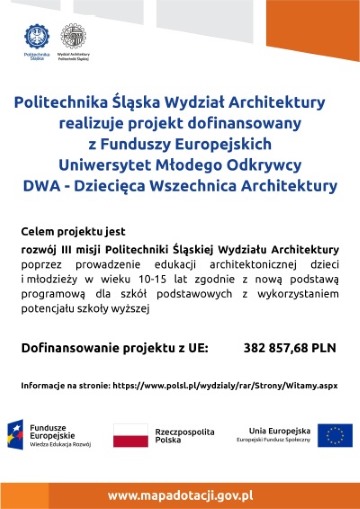 Przypominamy: Projekt jest współfinansowany przez Unię Europejską w ramach Europejskiego Funduszu Społecznego ze środków programu Uniwersytet Młodego Odkrywcy, Oś III Szkolnictwo wyższe dla gospodarki i rozwoju, Program Operacyjny Wiedza Edukacja Rozwój 2014-2020, Działanie 3.1 Kompetencje w szkolnictwie wyższym. Projekt realizowany jest na Wydziale Architektury Politechniki Śląskiej w latach 2018-2020. Kierownik projektu: dr hab. inż. arch. Beata Majerska-Pałubicka, Kierownik Katedry Projektowania Architektury Użyteczności Publicznej i Mieszkaniowej RAr-2. Projekt skierowany jest do uczniów i uczennic klas IV-VIII ze szkół podstawowych z Gliwic i powiatu gliwickiego zainteresowanych poszerzaniem wiedzy z zakresu podstawowej edukacji architektonicznej. Realizowany jest z zachowaniem zasady równości szans i niedyskryminacji, w tym dostępności dla osób z niepełnosprawnościami, a także z zachowaniem zasady równości szans kobiet i mężczyzn oraz zgodnie z pozostałymi politykami i zasadami wspólnotowymi.