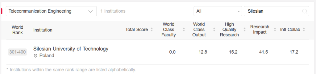 In this year’s GRAS 2025 ranking, the Silesian University of Technology appears in six fields, including Telecommunication Engineering, where it is listed as one of only two universities in Poland.