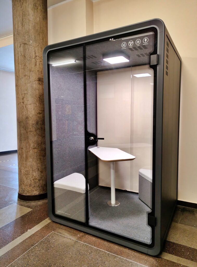 The booth is soundproofed and equipped with lighting and ventilation. It is possible to connect devices such as a laptop or a phone charger. It can accommodate up to two people at a time.