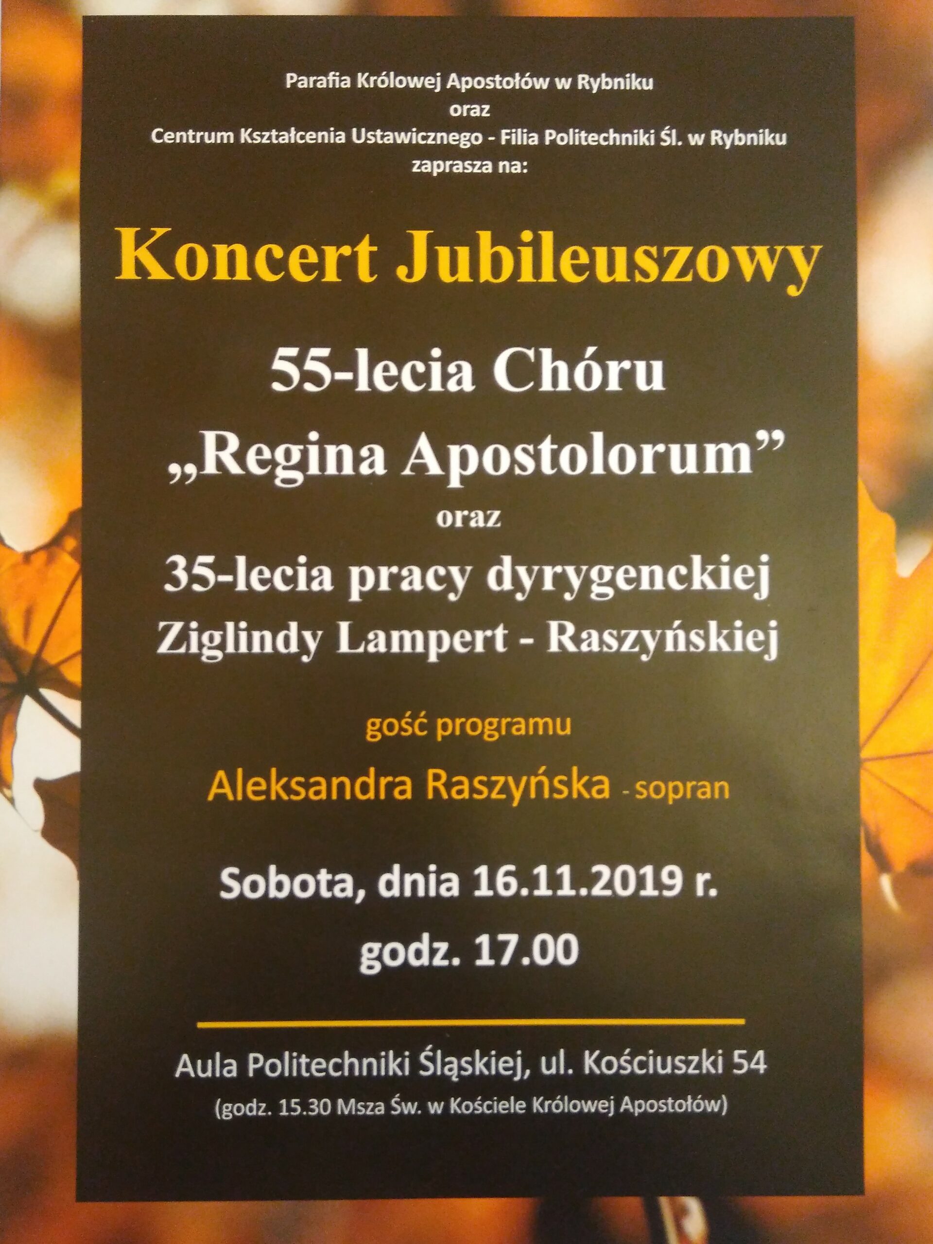 Parafia Królowej Apostołów w Rybniku oraz Centrum Kształcenia Ustawicznego - filia Politechniki Śląskiej zapraszają na Koncert Jubileuszowy 55-lecia Chóru "Regina Apostolorum" i 35-lecia pracy dyrygenckiej Ziglindy Lampert-Raszyńskiej, który odbędzie się w sobotę 16.11.2019 r. o godz. 17.00 w Auli Centrum Kształcenia Ustawicznego w Rybniku przy ul. Kościuszki 54.