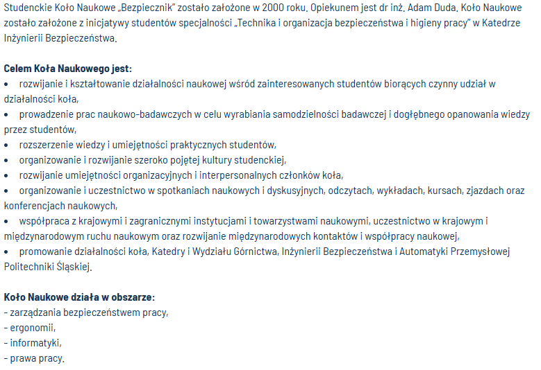 Koła naukowe działające na Wydziale Górnictwa, Inżynierii Bezpieczeństwa i Automatyki Przemysłowej.